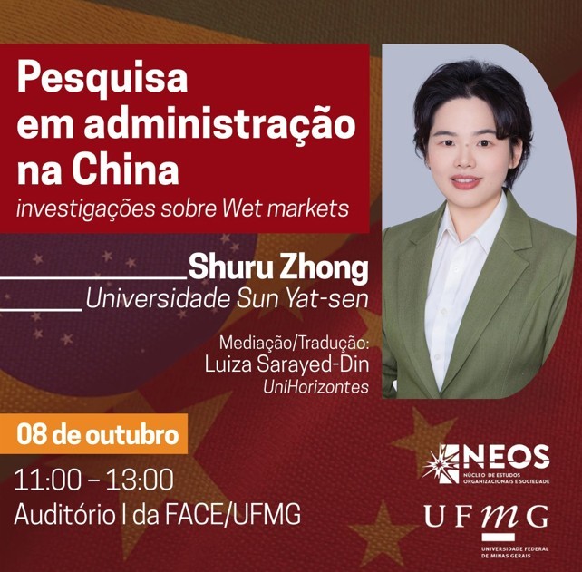 Informamos a realização da palestra "Pesquisa em Administração na China", com a Profa. Dra. Shuru Zhong, da Universidade Sun Yat-sen. O evento acontecerá no dia 08 de outubro, das 11:00 às 13:00, no Auditório I da FACE/UFMG. A palestra abordará suas investigações sobre os Wet Markets na China, um tema relevante e atual no campo da administração.