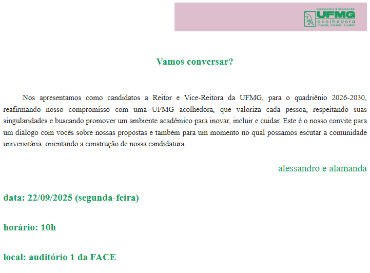No dia 22 de setembro, segunda-feira, às 10:00h, no Auditório 1, receberemos os candidatos a Reitor e Vice-Reitora da UFMG, para o quadriênio 2026-2030. Este será um momento de conhecê-los um pouco melhor, assim como ouvir suas propostas para nossa Universidade. Será também uma oportunidade ímpar para estabelecermos outros diálogos e apresentar-lhes demandas específicas da nossa unidade e do nosso corpo funcional.